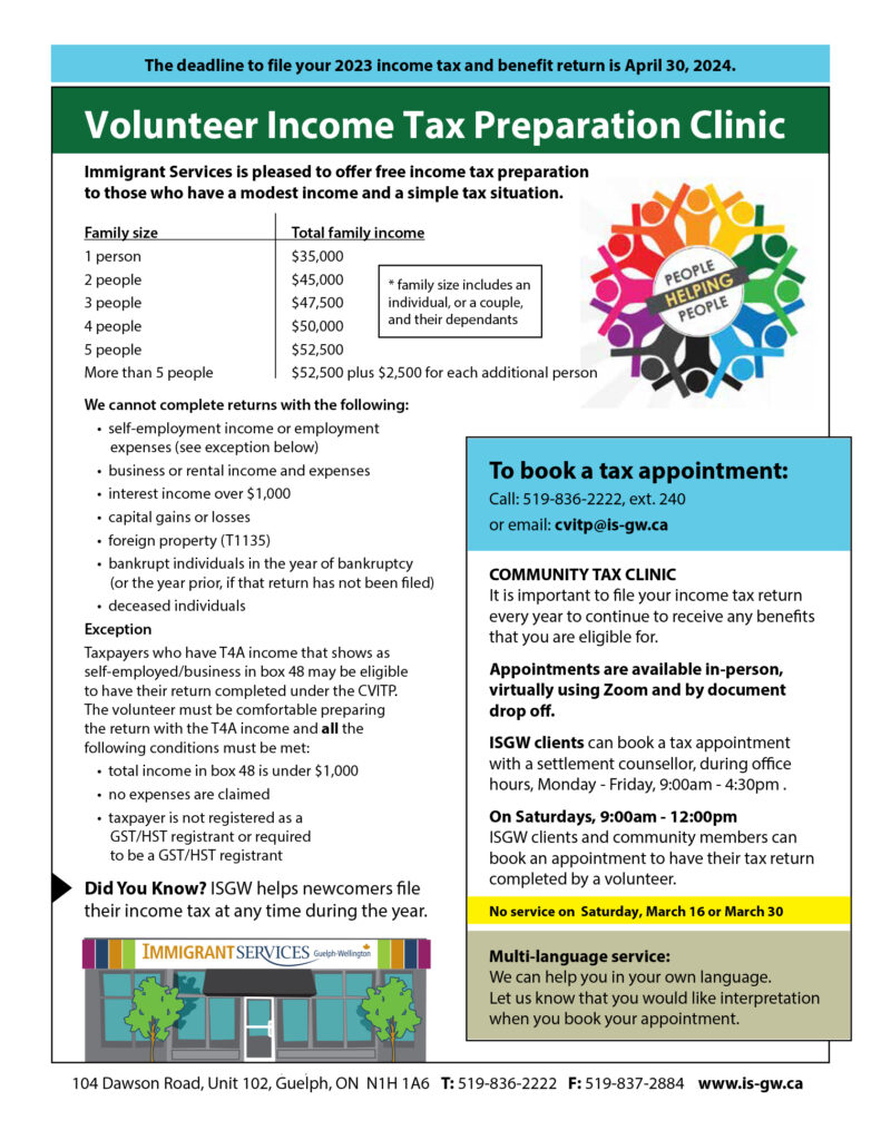Immigrant Services Guelph-Wellington has been organizing assistance with tax preparation through CRA’s Community Volunteer Income Tax Program (CVITP) since 2007. We are very pleased to be offering free income tax preparation again this year, for those who have a modest income and a simple tax situation.